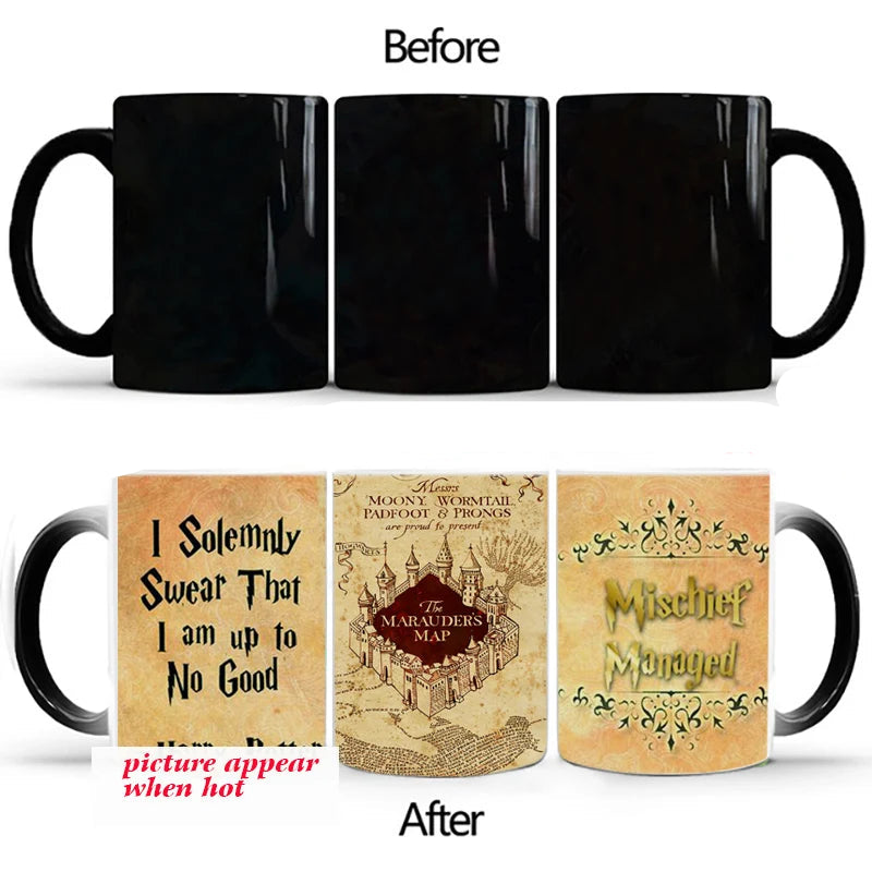 The design is amazing — when the mug is cold it looks plain, but as soon as you pour something hot, the Marauder’s Map appears. It never gets old watching it change.